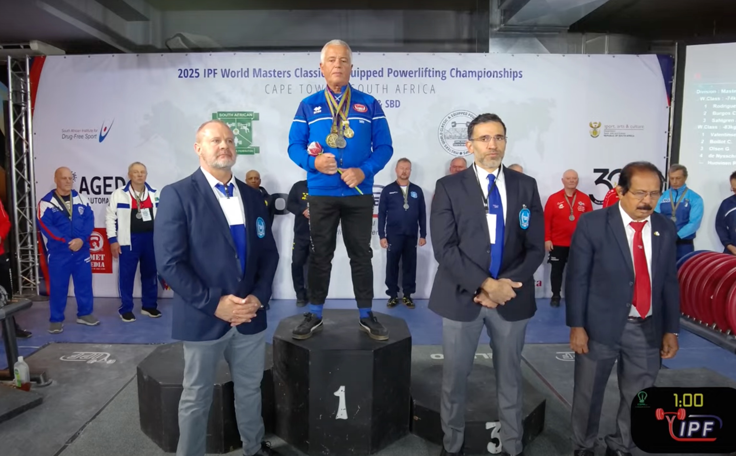 Sæmundur var fyrstur á pallinn. Í hnébeygju opnaði hann örugglega á 150 kg og önnur hnébeygjan jafnörugg með 160 kg. Þriðja hnébeygju með 172,5 kg á stönginni var tilraun til Íslandsmets en því miður vildi hún ekki upp að þessu sinni. Í bekkpressu opnaði Sæmundur á þægilegum 100 kg. Hækkaði í annarri upp í 110 kg sem fór hratt upp. Í þriðju bekkpressu reyndi Sæmundur við 120 kg og að bæta eigið Íslandsmet. Það vantaði aðeins herslumuninn að hann náði að klára hana. Sæmundur opnaði í réttstöðulyftu á 175 kg sem flugu upp. Sama gilti um lyftu tvö með 185 kg. Í lokalyftunni hækkaði hann í 200 kg sem var tilraun til Íslandsmets en því miður náði hann ekki að klára lyftuna. Samanlagður árangur varð 455 kg en sá árangur tryggði Sæmundi gull og heimsmeistaratitili ! Innilega til hamingju með flott mót og heimsmeistaratitilinn, Sæmundur !