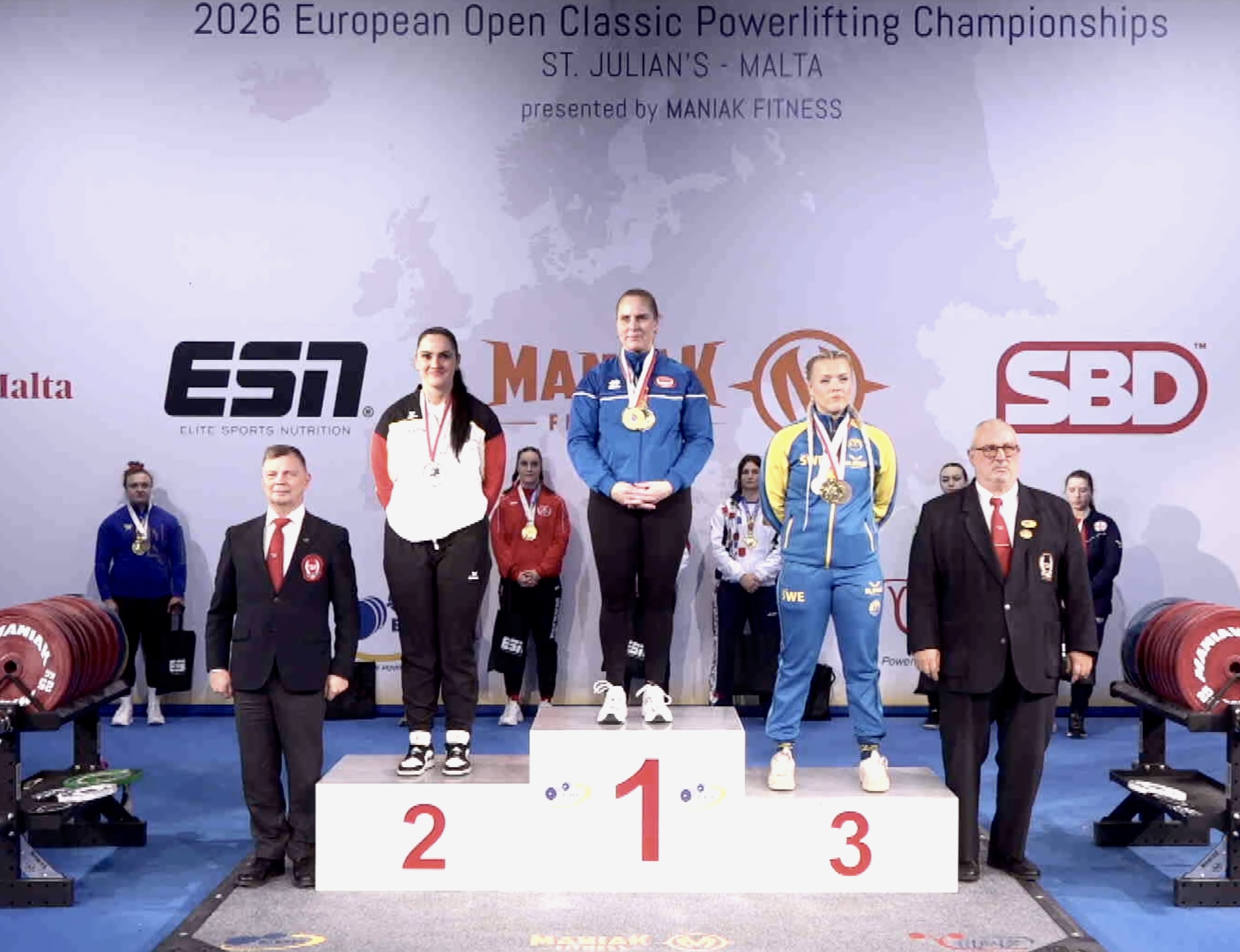 Kristín sem keppir í -84 kg flokki mætti svo sannarlega öflug á pallinn í dag. Fyrir mótið var Kristín tilnefnd í fyrsta sæti en allt getur gerst á pallinum á keppnisdegi. Kristín opnaði í hnébeygju með 205 kg sem hreyfðust vel. Í annarri beygjunni hækkaði hún í 215 kg sem hreyfðust eins og opnunin. Kristín hækkaði í 225 kg í lokabeygjunni sem hún kláraði með stæl. Sú lyfta var nýtt heimsmet og Evrópumet  í Master 1 (öldungaflokki 1) ! Kristín opnaði í bekkpressu með 112,5 kg. Hækkaði um 5 kg í annarri en náði ekki að klára lyftuna. Í þriðju umferðinni reyndi Kristín aftur við 117,5 kg sem fóru upp að þessu sinni. Kristín opnaði í réttstöðulyftu með 210 kg á stönginni. Hún hækkaði í 225 kg í annarri umferð og kláraði þá lyftu af öryggi. Sú lyfta var gaf Kristínu heimsmet og Evrópumet  í samanlögðu í Master 1 (öldungaflokki 1). Í þriðju og lokalyftunni reyndi Kristín við 235 kg sem hreyfðust ekki en það skipti ekki máli. Evrópumeistaratitilinn var kominn í hús ! Samanlagður árangur varð 567,5 kg. Innilega til hamingju með Evrópumeistaratitilinn og öll metin, Kristín !